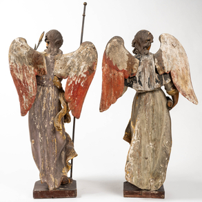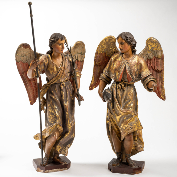 "Arcángel Gabriel y Ancángel Rafael" Conjunto de dos esculturas de bulto redondo en madera tallada y policromada. Trabajo Novohispano, S. XVIII